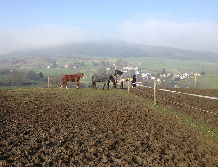 Auf 8 Hektar Land genießen unsere Pferde in Zweier- bis Vierergruppen ihren Auslauf. Alle Koppeln sind mit Matschpaddocks für die nassen Herbst- und Wintertage ausgestattet.